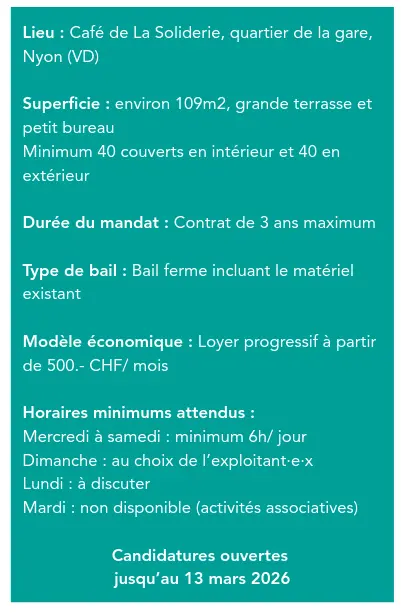 Souhaitant se concentrer sur ses activités solidaires, son engagement en faveur de la durabilité et de la justice sociale, ainsi que sur son offre culturelle, l’association La Soliderie lance un appel afin de sélectionner une structure ou une personne exploitant·e·x pour la gestion du café, dans le cadre d’un contrat de sous-location et dans le respect de ses valeurs et de ses buts.